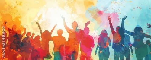 Colorful watercolor painting of a group of young people jumping and dancing with raised hands.