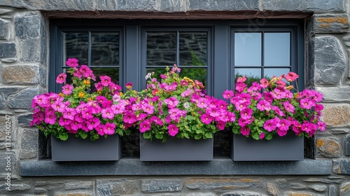 Colorful window boxes filled with vibrant pink flowers, adding a pop of color to a stone exterior