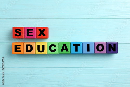 Colorful wooden blocks with phrase "SEX EDUCATION" on light blue background, flat lay