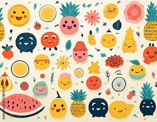 Colorido dibujo a mano de dibujos animados de frutas tropicales lindos y caras soleadas en un fondo ligero