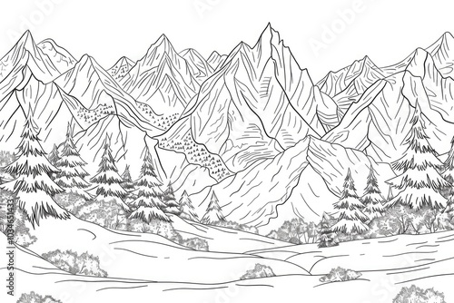 Coloring book illustration of a snowy mountain landscape with towering peaks and serene winter scenery