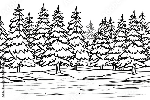 Coloring book illustration of a winter scene featuring snow covered trees beside a frozen lake