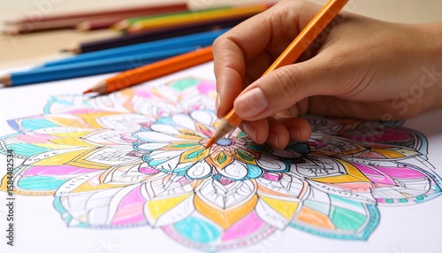 Coloring detailed mandala pattern with vibrant pencil shades, hand in focus.