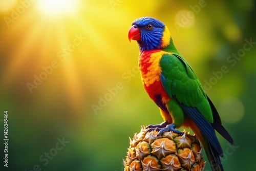 Colourful bird perched on a pineapple under the sun, sunny, tropical