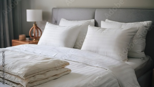 Comforting bed with a gray headboard. White pillows and a neatly folded blanket create an inviting scene.