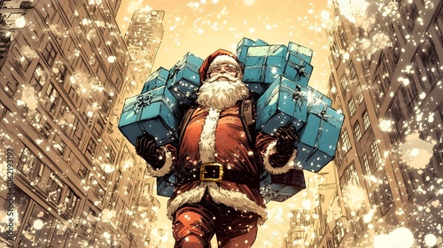 Comic book art picture of Santa Claus carrying many blue gift boxes on his back, in the city center during Christmas time and snowflakes falling from above.