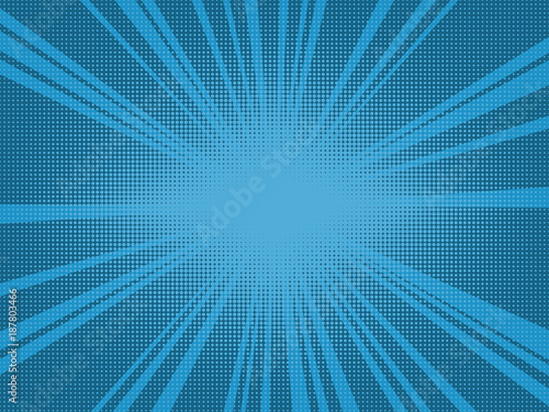 Comic book pop art retro background with halftone dots and radial rays.