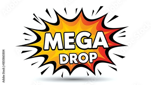 Comic book style burst with MEGA DROP text in bold white letters on vibrant yellow to red gradient background with black outline explosion rays.