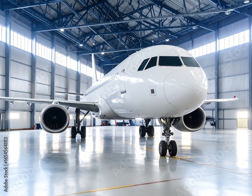 Commercial airplane inside a hangar, ready for maintenance and technical revision