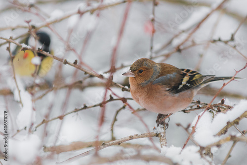 Common chaffinch, Fringilla coelebs on a branch, small passerine bird.