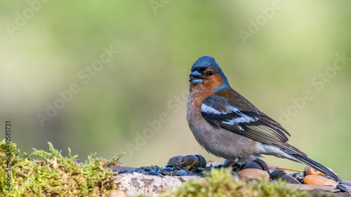 Common Chaffinch male sits on a stump in moss