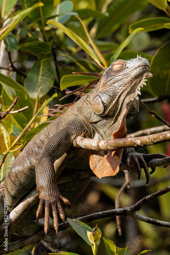 Common green iguana (Iguana iguana) resting on a tree in Tortuguero national park, Costa Rica