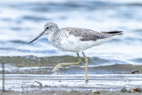 Common greenshank, Tringa nebularia, foraging in wetlands