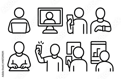 Communication and technology linear icons set: devices, people, and interaction