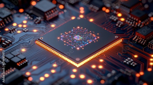 Compact quantum AI chip on a modern PCB design featuring illuminated data connections symbolizing efficient artificial intelligence processing and data flow systems , Minimalism Clean and clear