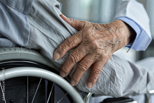 Compassionate Doctor Providing Comforting Touch to Elderly Patient in Wheelchair, Reflecting Support and Empathy in Healthcare Setting.