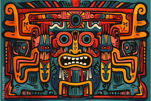 Complex Aztec-inspired artwork full of mythological symbols and bright colors including red, yellow, and blue, with intricate detailing and spiritual connections, favorable for cultural themes.