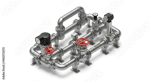 Complex Piping System with Valves and Gauges Isolated on White Background