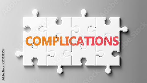 Complications complex like a puzzle - pictured as word Complications on a puzzle pieces to show that Complications can be difficult and needs cooperating pieces that fit together, 3d illustration