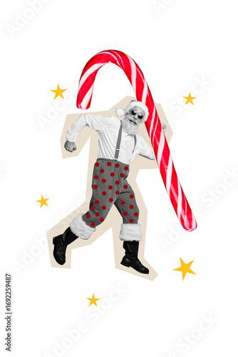 Composite trend artwork sketch image photo collage of merry Christmas holiday celebrate winter season aged man santa claus walk hold candy