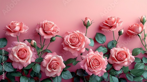 Composition, frame corner folded from pink roses. Pink background and place for text. Roses flowers pattern top view, flat lay, copy space for text. Banner. : Generative AI