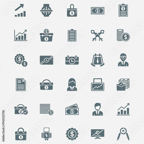 Comprehensive collection of monochrome business and finance icons, ideal for digital interfaces, financial reports, economic data visualization, and corporate analytics presentations
