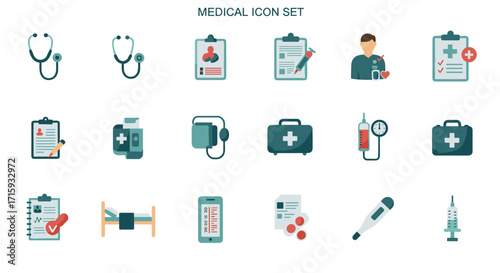 Comprehensive medical icon set featuring flat design elements for healthcare applications