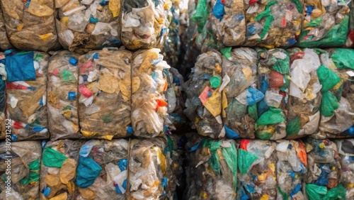 Compressed Circular Bales of Waste Plastic Stacked for Recycling Process