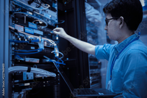 Computer engineer is setting up network in server room,Systems Maintenance Technician,Male engineer working in server room at modern data center
