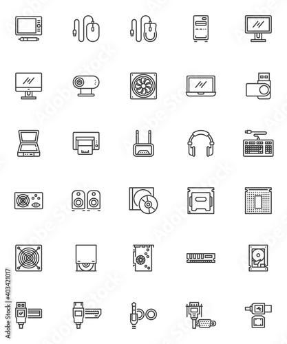 Computer hardware line icons set. linear style symbols collection, outline signs pack. vector graphics. Set includes icons as hard disk, usb, laptop computer, cpu microchip, power unit, pc mouse
