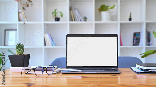 Computer laptop with blank screen, books and potted plant on wooden table.