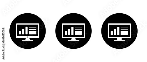 Computer monitor with business dashboard interface. Bar chart and infographic icon in black circle