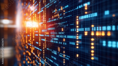 Computer screen displaying glowing light with abstract data flowing through a network of connections