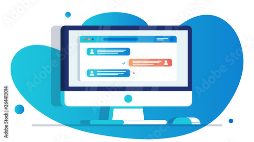 Computer screen with open browser window. Messenger app with user speech bubbles with text. Online chatting and communication concept. Working chat group. Office worker workplace