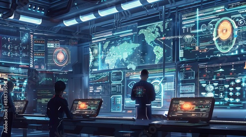 Concept art of a futuristic classroom in the computer era, with holographic displays, advanced learning tools, and students interacting with technology