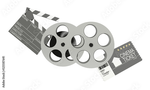 concept film producer This includes the film reels, monitors, cinematographers, movie tickets and filmmaking equipment, and a discrete clapperboard on background. 3d render PSD