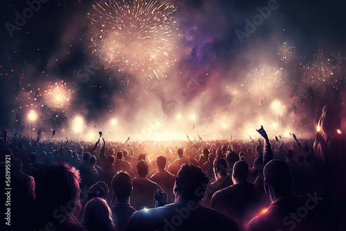 Concept of a happy crowd and fireworks for the New Year. Generative AI