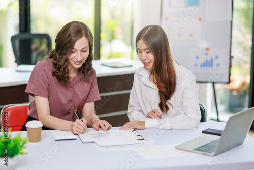 Concept of business office woman working,Businesswoman smile while working about her invesment plan with analyzing document and business investment graph data by using laptop on desk in workstation.