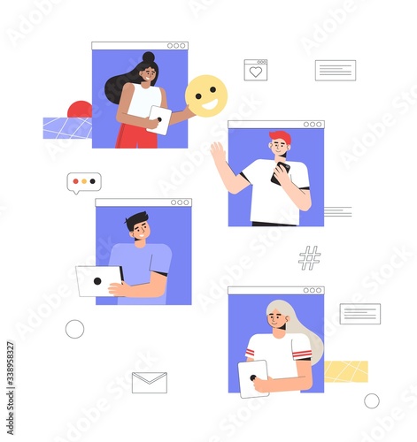 Concept of online communication and social networks. A group of people communicate with each other online, hold smartphones and laptops, and pass each other a smiley icon.