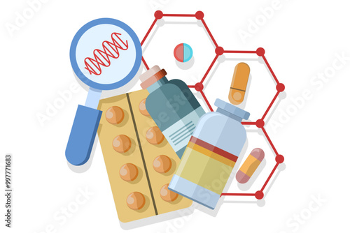 Concept of pharmaceutical drug products produced from biological sources. Biopharmaceutical products, biopharmacological products, medical products, natural pharmaceuticals. Flat vector illustration.