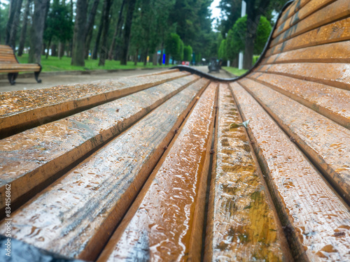 Concept of rain in the park. Wet bench close-up. Wooden bench after the rain.