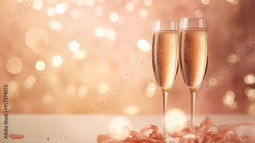 Concept with the rose and glasses of champagne in beige bokeh background. Neural network ai generated art