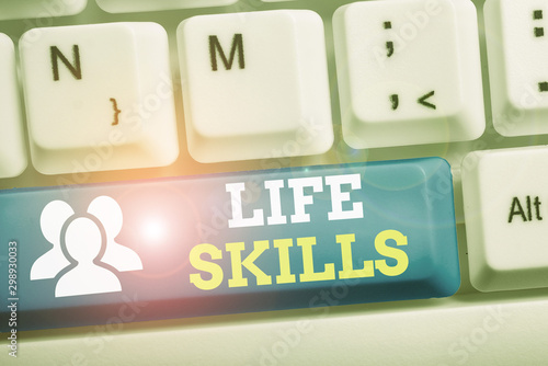 Conceptual hand writing showing Life Skills. Concept meaning skill that is necessary for full participation in everyday life Keyboard with note paper on white background key copy space