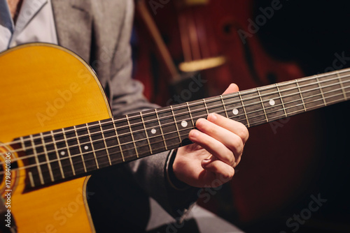 Concert view of acoustic electric guitar player with vocalist and rock band performing in a club, male musician guitarist on stage with audience in a crowded concert club hall arena, hands on guitar