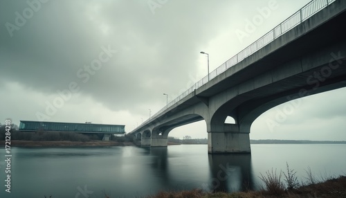 Concrete bridge spans wide river under overcast sky. Modern architectural structure includes road and railings. Building with glass facade visible on distant bank. Water reflects bridge arches.