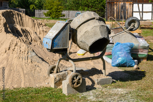 Concrete mixer. Construction site cement mixer machine, tools and sand