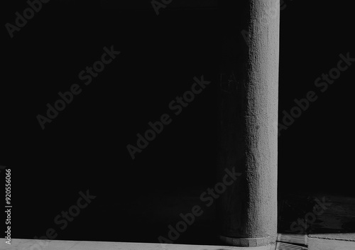 Concrete Pillar Illuminated by Sun: Exploring Building Architecture and Negative Space.Black and white. Monochrome. Minimalism.