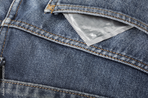 Condom in blue jeans pocket.
