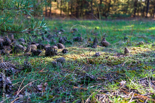Cones in a sunny forest on the ground under a pine tree. Sprinkled cones