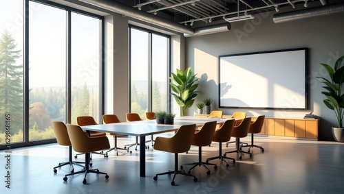 Conference room with large windows and mustard yellow chairs.
